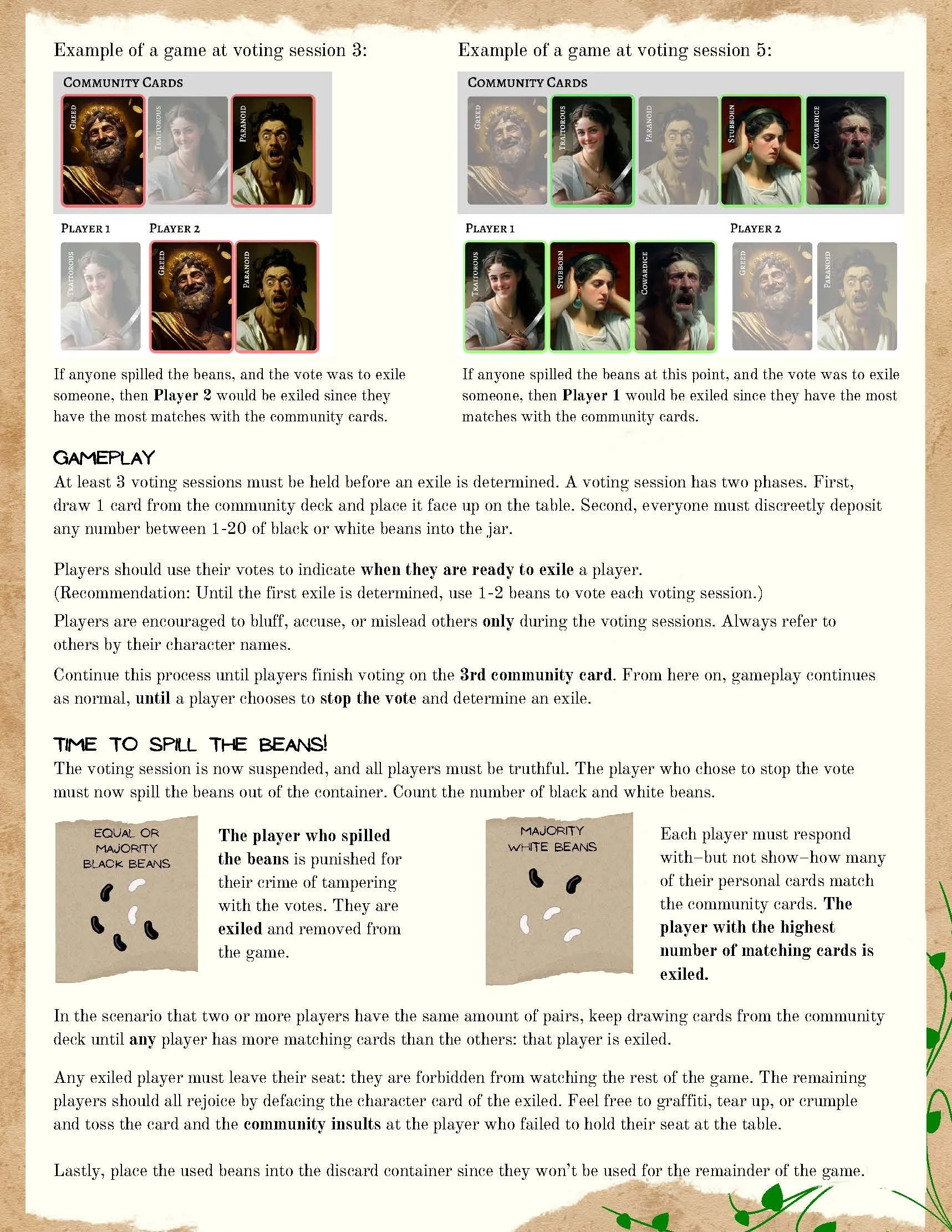 In Spill the Beans: Athenian Exile, players become Athenian politicians at risk of exile. The community has turned against past virtues, and survival depends on deception, timing, and knowing when to spill the beans—literally.